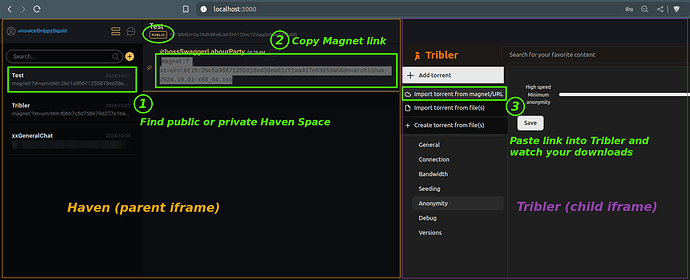 Tribler with Haven in iFrame - good for one-off access to Haven chats with Magnet links, as the moment you copy Magnet link and leave chat, Haven loses state and logs you out which most people who didnāt login just to get one link and leave would find that annoying. But those who want a built-in way to lock their Haven session when theyāre not accessing it may like this better.